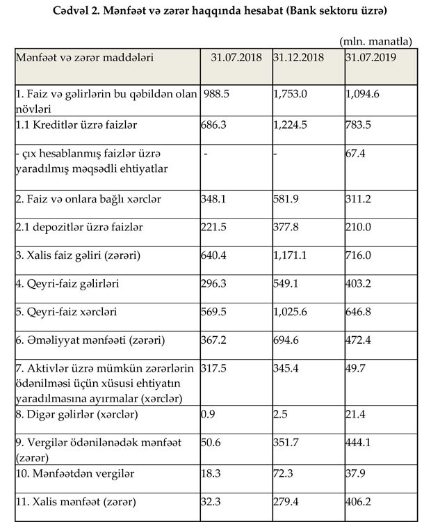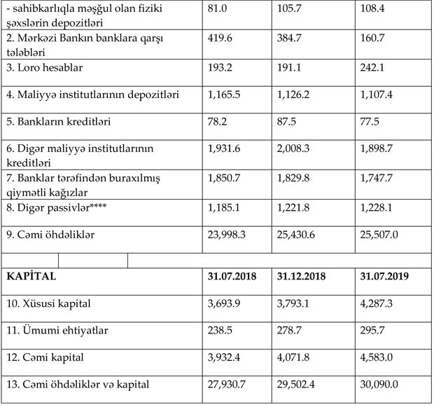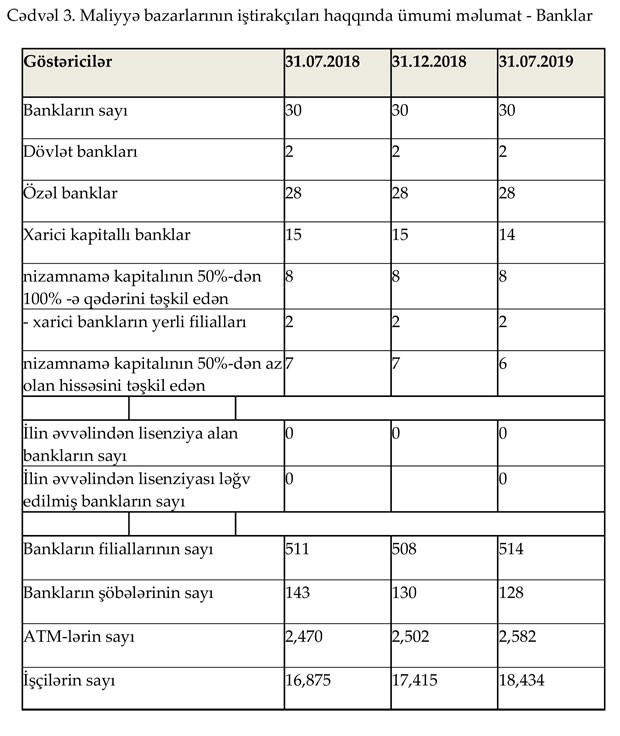 Maliyyə Bazarlarına Nəzarət Palatası 31 iyul 2019-cu il tarixinə Bank sektorunun icmal göstəricilərini açıqlayıb. "Marja", müqayisələrin asan aparılması və vəziyyətin daha aydın başa düşülməsi üçün 31 iyul 2019-cu il tarixinə göstəricilər ilə bərabar 31 iyul 2018-ci il və 31 Dekabr 2018-ci il tarixinlərinə olan icmal göstəriciləri də təqdim edir.