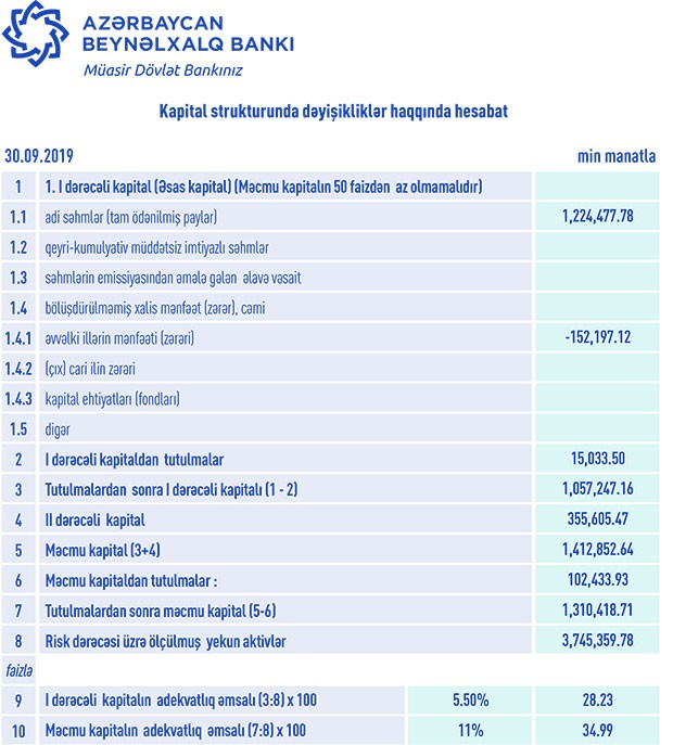 30 Sentyabr 2019-cu il tarixində “Azərbaycan Beynəlxalq Bankı” ASC 9 milyard 321 milyon 336 min manat cəmi aktivlərə malik olub. Bankın cəmi aktivləri ötən ilin sonu ilə müqayisədə 1 milyard 388 milyon 565 min manat və ya 17,5% artıb.
