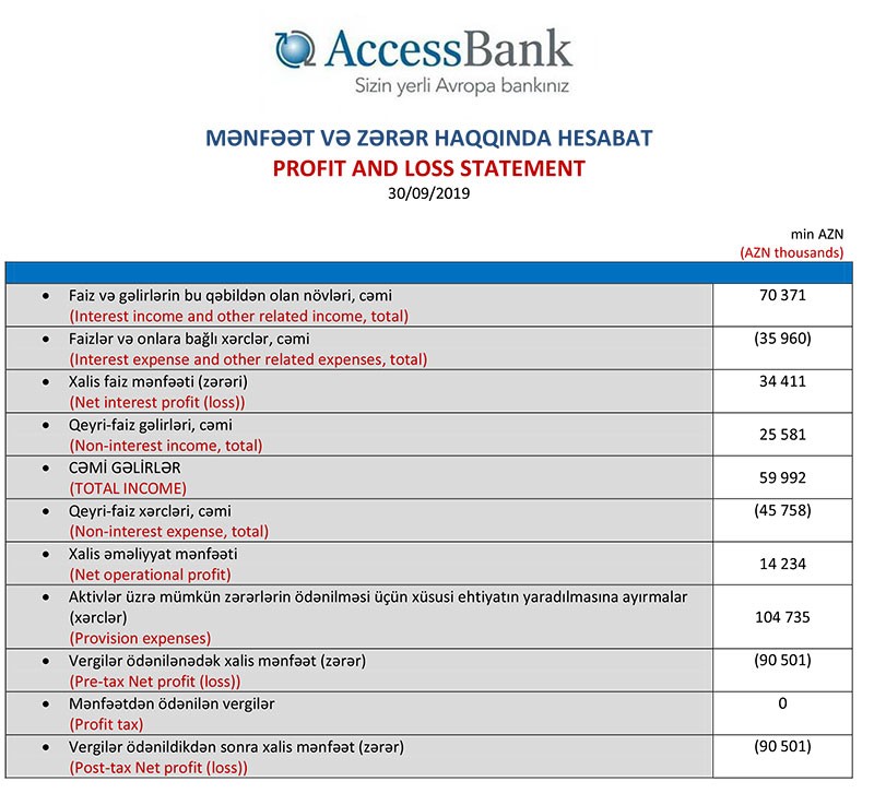 2018-ci ilin yanvar-sentyabr dövrü ilə müqayisədə 2019-cu ilin yanvar-sentyabr dövründə “AccessBank”ın faiz xərcləri 3 milyon 399 min manat azalaraq 35 milyon 960 min manat, qeyri-faiz xərləri isə 1 milyon 592 min manat artaraq 45 milyon 758 min manat təşkil edib.