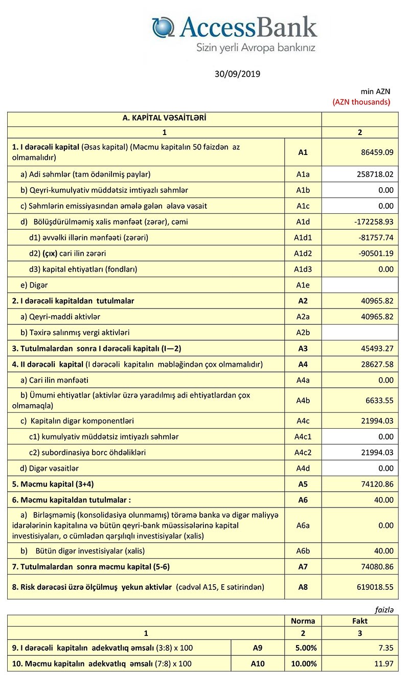 Bu ilin 90 milyon 501 min manat xalis zərər ilə “AccessBank”ın yığılmış zərəri 172 milyon 258 min manata çatıb. Bank 258 milyon 718 min manat nizamnamə kapitalına malik olduğundan bu zərər ödənib və bundan sonra “AccessBank”ın 93 milyon 93 min manat cəmi kapitalı da mövcuddur.