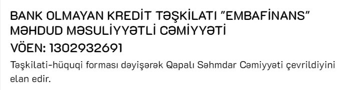"Marja" şirkətin elanına istinadən xəbər verir ki, "Embafinans" təşkilati-hüquqi formasını dəyişərək Qapalı Səhmdar Cəmiyyətinə (QSC) çevrilib.