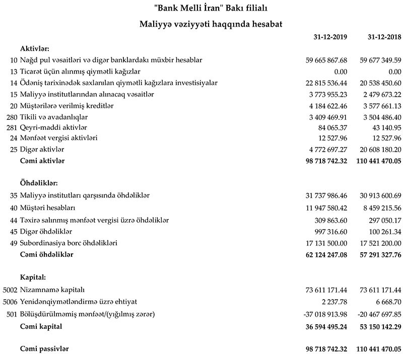 "Bank Melli İran" Bakı filialı 2019-cu ili 16 milyon 556 min manat zərər ilə başa vurub. Müqayisə üçün qeyd edək ki, filial 2018-ci ili 2 milyon 141 min 532 manat xalis mənfəət ilə bağlamışdı.