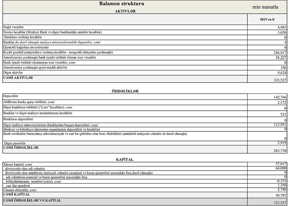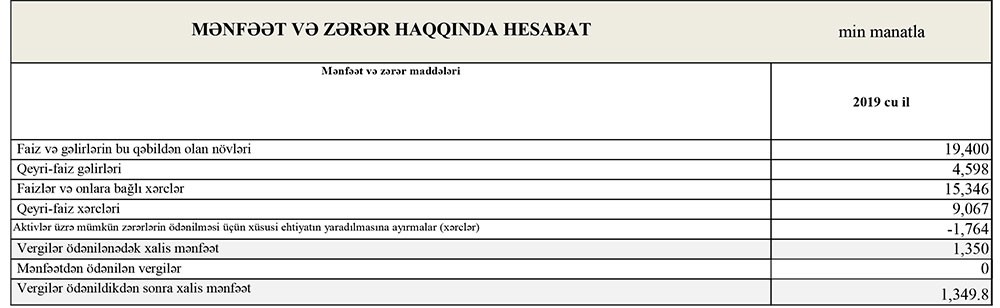 2018-ci ildə faiz gəlirləri 17 milyon 571 min manat ikən 2019-cu ildə 19 milyon 400 min manat, 2018-ci ildə qeyri-faiz gəlirləri 3 milyon 386 min manat ikən, 2019-cu ildə 4 milyon 598 min manat təşkil edib.