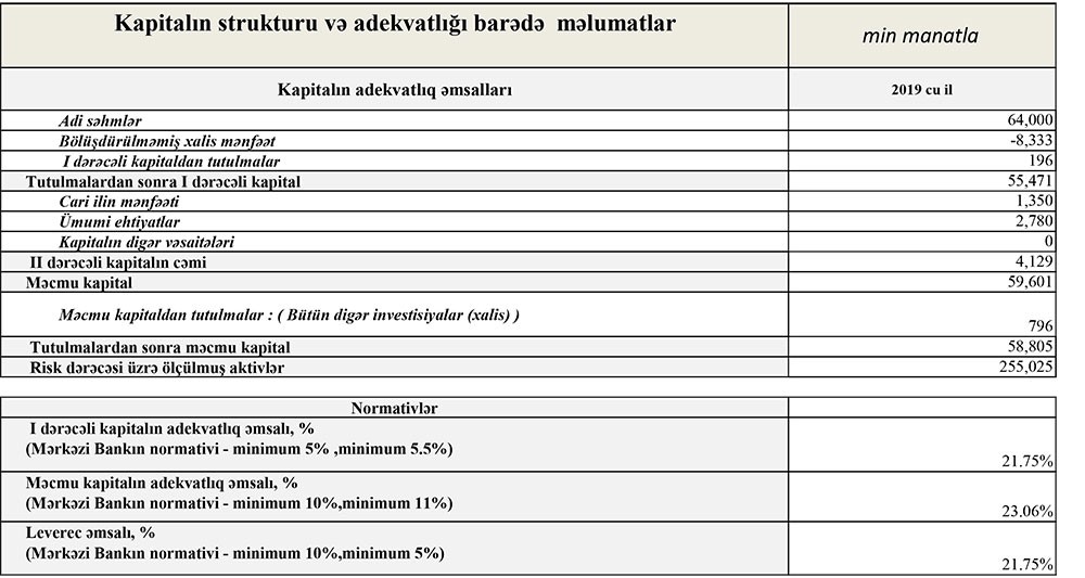 31 Dekabr 2019-cu il tarixində “NBC Bank” ASC 59 milyon 601 min manat məcmu kapitala malik olub. Bank 2018-ci ilin sonunda 57 milyon 88 min manat məcmu kapitala malik idi.
