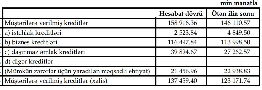 Bankın istehlak kreditləri portfeli isə 2 milyon 326 min manat azalaraq 2 milyon 523 min manata düşüb.