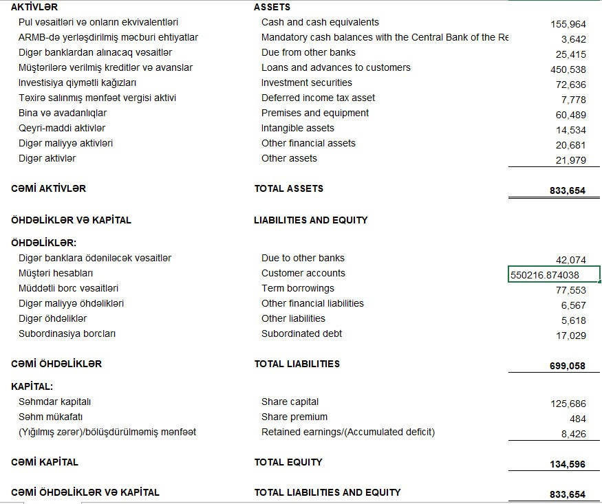 Ötən il müştəri hesabları (depozitlər) 82 milyon 965 min manat və ya 17,7% artaraq 550 milyon 216 min manata çatıb.