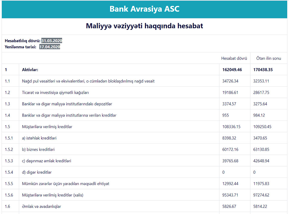 Ötən ilin sonu ilə müqayisədə “Bank Avrasiya”nın kredit portfeli 914 min manat azalaraq 108 milyon 336 min manata düşüb. Bankın cəmi aktivləri isə 170 milyon 438 min manatdan 162 milyon 49 min manata geriləyib.