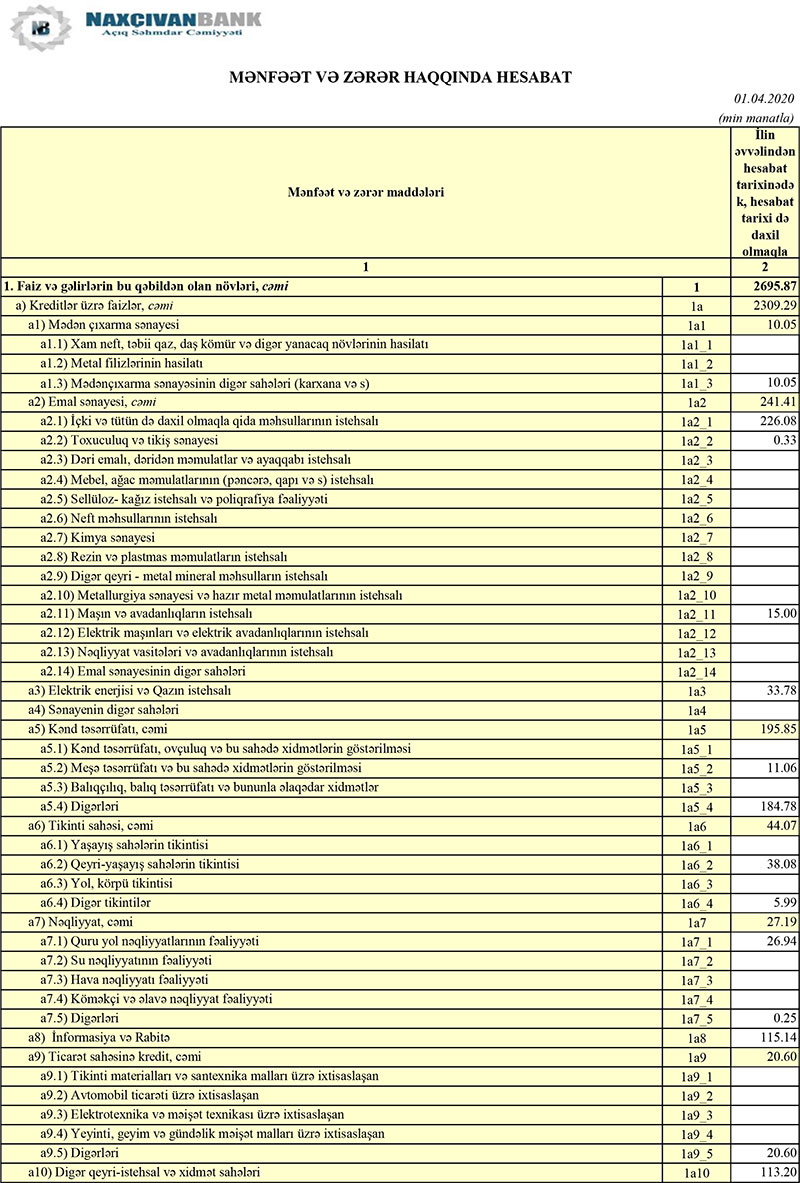 “Naxçıvanbank” ASC 2020-ci ilin ilk rübünü 2 milyon 177 min manat xalis ilə başa vurub. Halbuki, Bank ötən ilin eyni dövrünü 1 milyon 117 min manat xalis mənfəət ilə bağlamışdı. Beləliklə, “Naxçıvanbank”ın xalis mənfəəti təxminən 2 dəfə artıb.