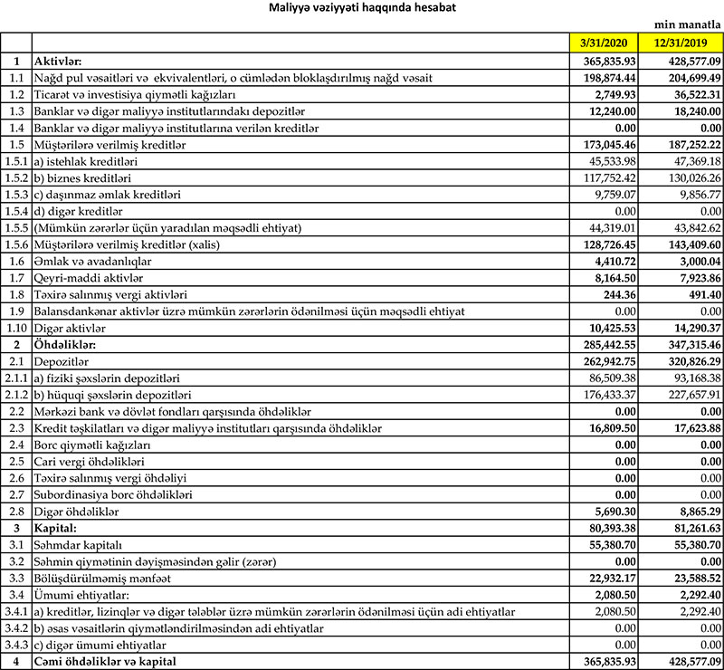 Marja Bankın maliyyə göstəricilərinə istinadən xəbər verir ki, 2020-ci ilin yanvar-mart dövründə Yapı Kredi Bank Azərbaycan-ın cəmi əməliyyat gəlirləri 10 milyon 693 min manat, cəmi əməliyyat xərcləri 7 milyon 49 min manat təşkil edib. Gəlirlər xərcləri üstələdiyindən Bankın 3 milyon 644 min manat əməliyyat mənfəəti yaranıb. Lakin mümkün zərərlər üçün yaradılan ehtiyatlara 4 milyon 52 min manat ayrıldığından və 247 min manat mənfəət vergisi ödənildiyindən bank ilk rübü 656 min manat xalis zərər ilə bağlayıb.