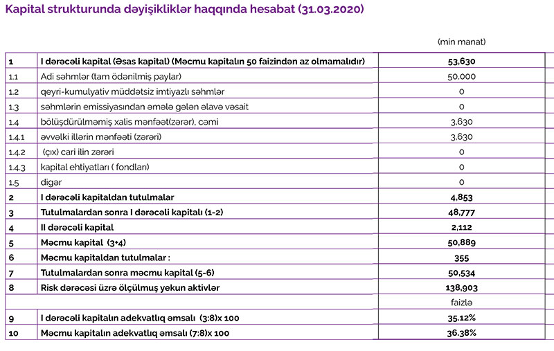 2019-cu ilin 1-ci rübündə faiz gəlirləri 5 milyon 445 min manat, qeyri – faiz gəlirləri isə 2 milyon 422 min manat ikən, 2020-ci ilin 1-ci rübündə faiz gəlirləri 5 milyon 180 min manat və qeyri – faiz gəlirləri 2 milyon 452 min manat təşkil edib.
