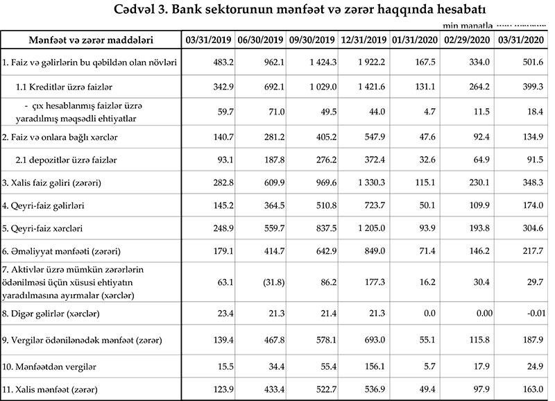 Mərkəzi Bank 31 mart 2020-ci il tarixinə olan bank sektorunun əsas göstəricilərini açıqlayıb.