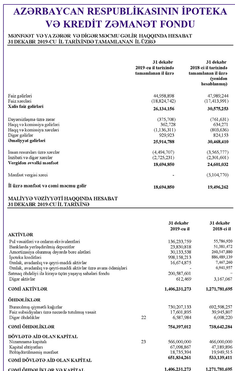İpoteka və Kredit Zəmanət Fondu (İKZF) 2019-cu ilin 18 milyon 695 min manat xalis mənfəət ilə başa vurub.