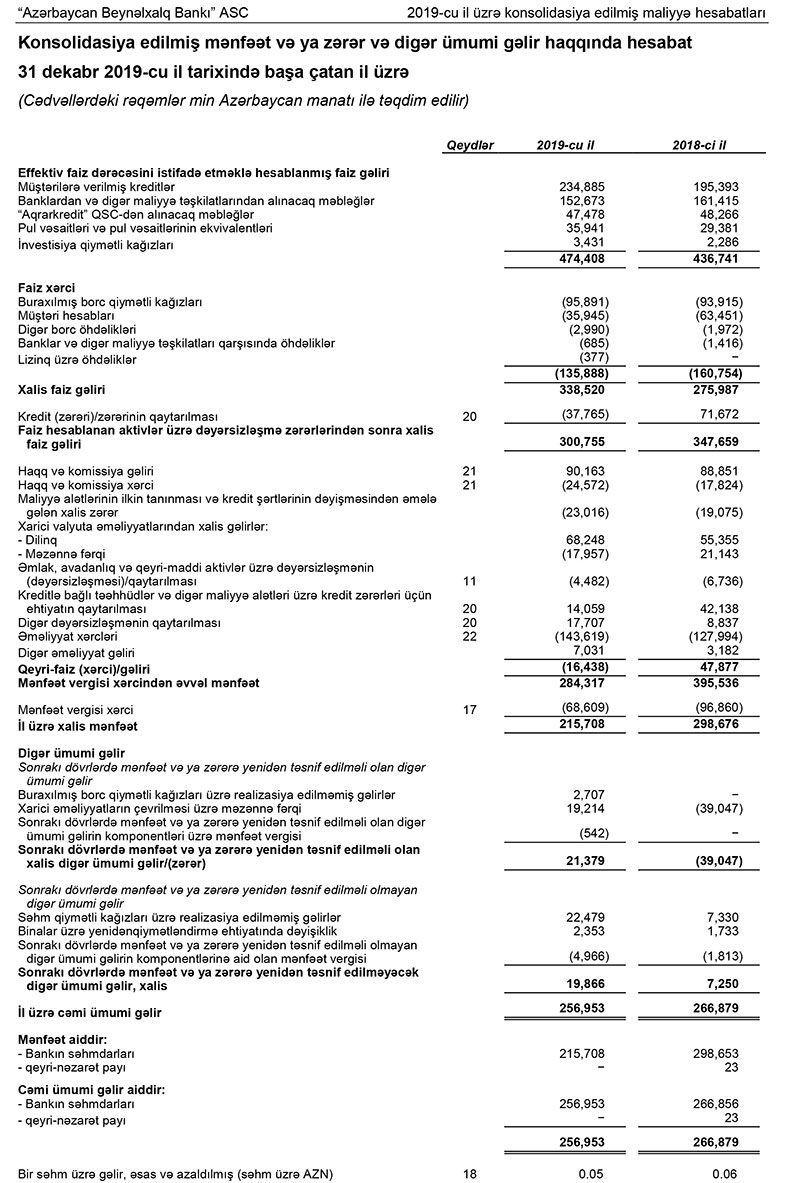 Bank 2019-cu ili ümumilikdə 215 milyon 708 min manat xalis mənfəətlə başa vurub. Əməliyyat mənfəətinin 14,8% artmasına baxmayaraq xalis mənfəətin azalması ehtiyatlardan azadolmanın azalması və mənfəət vergisi xərcinin hesablanması ilə bağlıdır.
