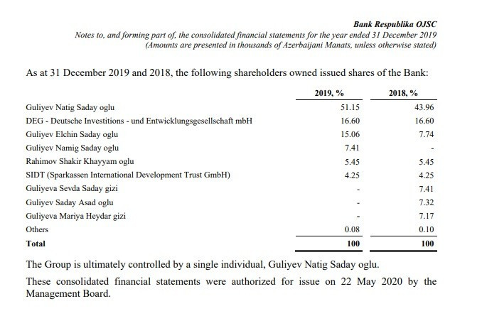 Məlumata görə, “Bank Respublika”nın səhmlərinin 7,41%-nə nəzarət edən Sevda Natiq qızı Quliyevanın payı Namiq Saday oğlu Quliyevə (yeni səhmdar), 7,32%-nə nəzarət edən Saday Əsəd oğlu Quliyevin payı Elçin Saday oğlu Quliyevə (Müşahidə Şurasının üzvü), 7,17%-nə nəzarət edən mərhum Mariya Heydər qızı Quliyevanın payı isə Natiq Saday oğlu Quliyevə (Müşahidə Şurasının üzvü) keçib.