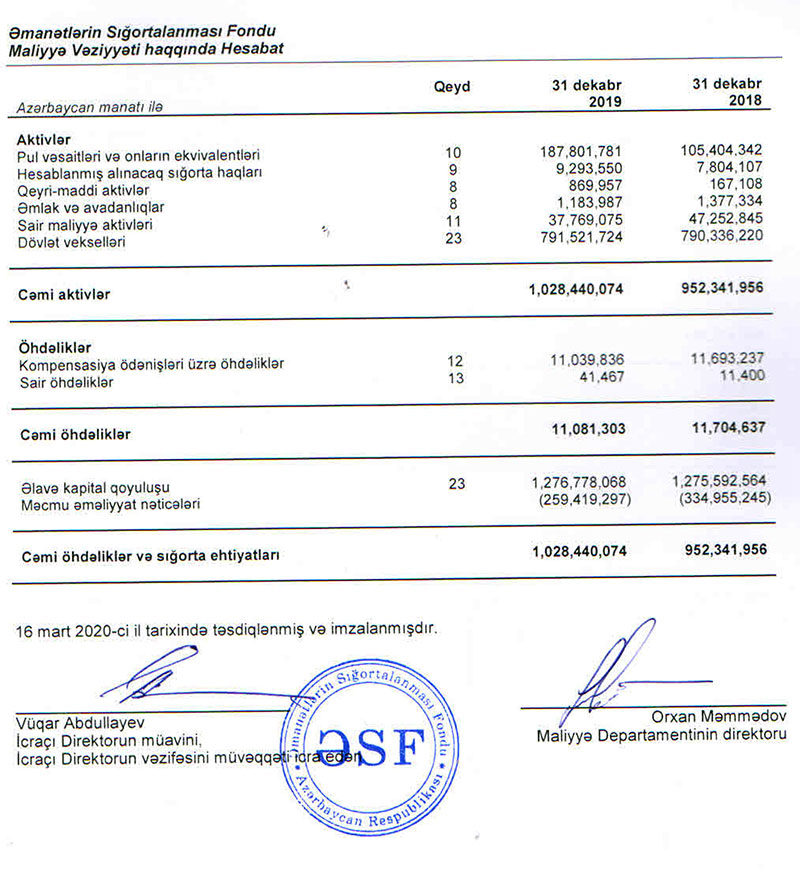 Hesabat dövründə Fondun öhdəlikləri 5,3% azalaraq 11,1 milyon manata, o cümlədən kompensasiya ödənişi üzrə öhdəlikləri 6,5% azalaraq 11 milyon manata düşüb, balans kapitalı isə 8,2% artaraq 1 milyard 17,4 milyon manata çatıb.