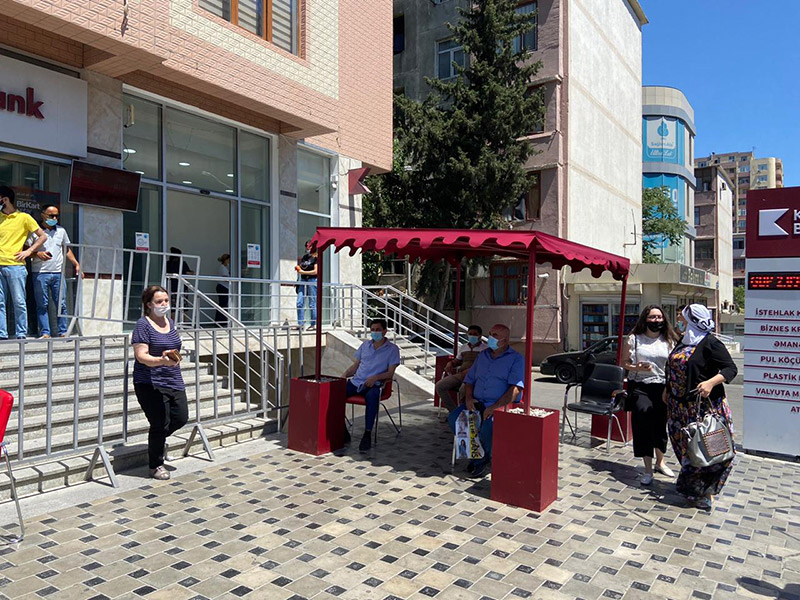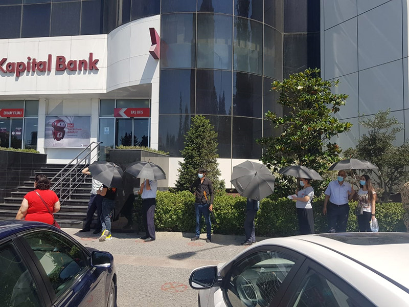 Kapital Bank filialların önündə müştəriləri günvurmadan qoruyur