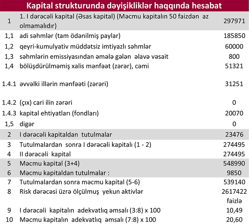 Xatırladaq ki, 2019-cu ilin 9 ayında Kapital Bankın cəmi əməliyyat gəlirləri 407 milyon 203 min manat, cəmi əməliyyat xərcləri 198 milyon 721 min manat təşkil etmiş, gəlirlər xərcləri üstələdiyindən 208 milyon 482 min manat əməliyyat mənfəəti yaranmışdı. Həmin dövrdə əməliyyat mənfəətindən 82 milyon 746 min manatı mümkün zərərlər üçün yaradılan məqsədli ehtiyatlara ayırılmış, 26 milyon 80 min manat t mənfəət vergisi ödənilmişdi. Nəticədə Bank 99 milyon 654 min manat xalis mənfəət əldə etmişdi.