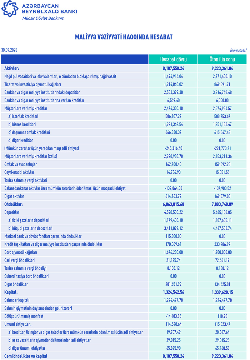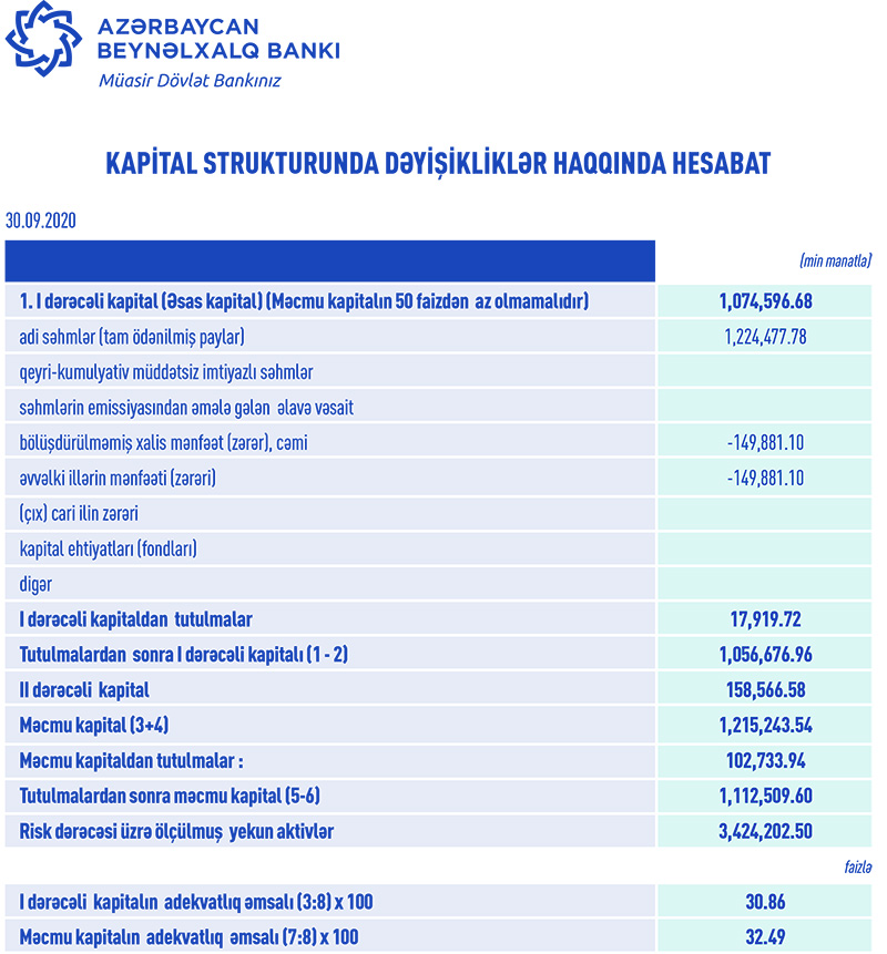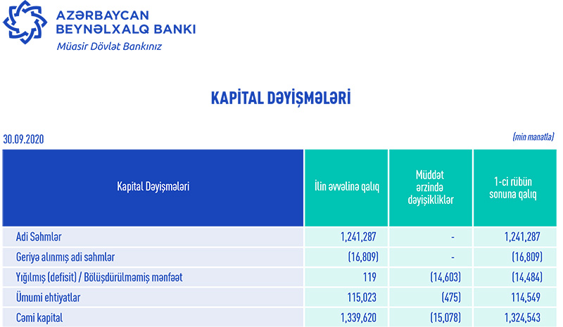 30 sentyabr 2020-ci il tarixində “Azərbaycan Beynəlxaıq Bankı” 1 milyard 112 milyon 509 min manat məcmu kapitala malik olub.