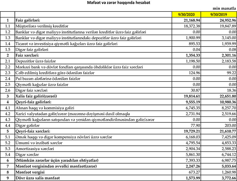 Qeyd edilib ki, Bankın 2020-ci ilin üçüncü rübünə dair açıqladığı hesabata əsasən xalis faiz gəlirləri 19.8 mln AZN olmuşdur.
