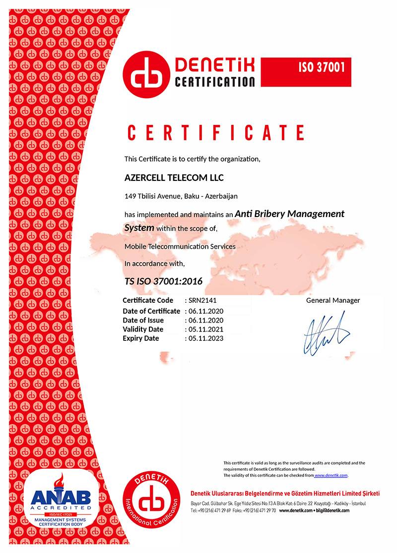 Azercell ölkəmizdə ISO 37001:2016 “Antikorrupsiya idarəetmə sistemi” standartlarına uyğunluq sertifikatını alan ilk mobil operator oldu(®️) Ölkənin rəqəmsal həllər təqdim edən lider mobil operatoru “Azercell Telekom” MMC ISO 37001:2016 “Antikorrupsiya idarəetmə sistemi” standartlarına uyğunluq sertifikatını əldə edərək yalnız rabitədə deyil, korporativ mədəniyyət sahəsində də öz birinciliyini nümayiş etdirmiş oldu. Sertifikatlaşdırılma auditi ABŞ-ın ən böyük akkreditasiya qurumu olan ANAB (ANSI National Accreditation Board) tərəfindən akkreditə olunmuş Türkiyənin Denetik Uluslararası Belgelendirme ve Gözetim Hizmetleri şirkəti tərəfindən keçirilmişdir.
