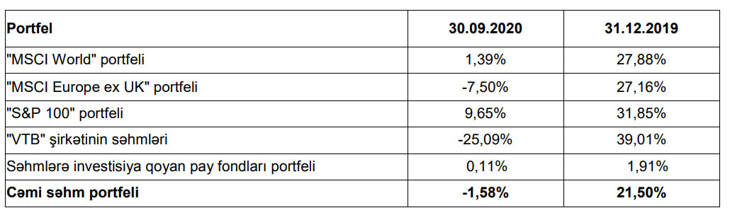 Ümumiyyətlə, 2020-ci ilin 9 ayı ərzində Fondun səhm portfelinin gəlirlilik göstəricisi -1,58% təşkil etmişdir.