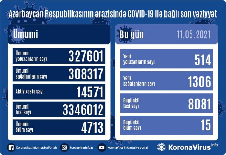 Azərbaycan Respublikasında koronavirus (COVID-19) infeksiyasına 514yeni yoluxma faktı qeydə alınıb, 1306nəfər müalicə olunaraq sağalıb.