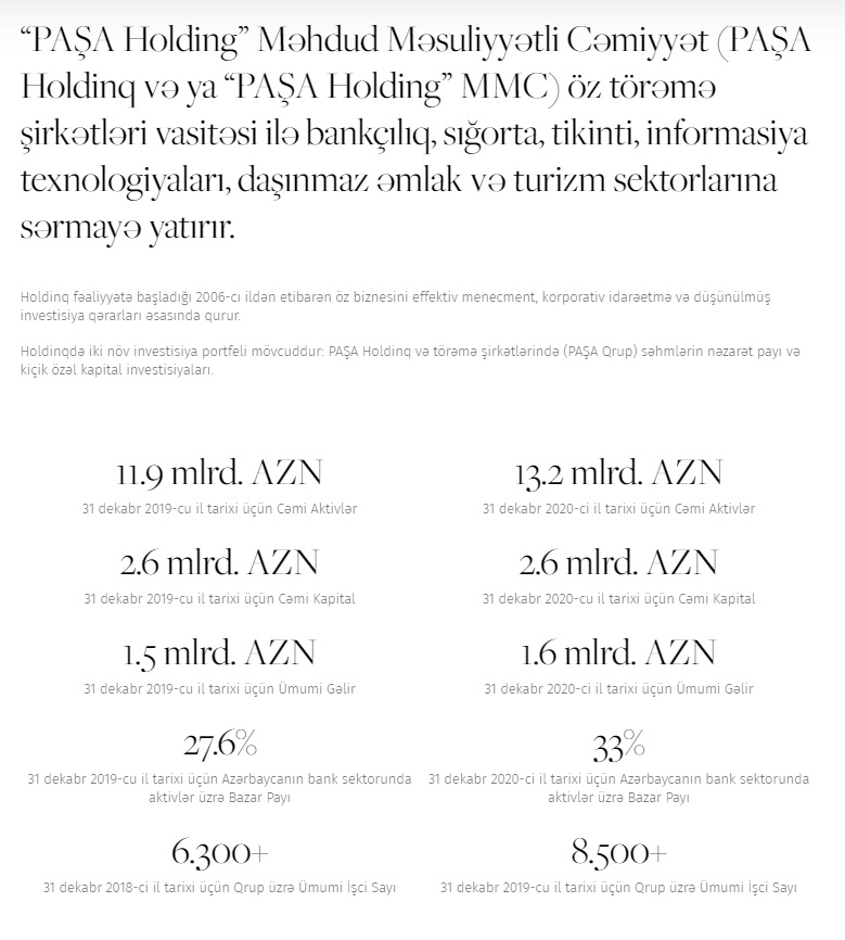 Xatırladaq ki, “PAŞA Holdinq” 2006-cı ildə yaradılıb. Holdinq Azərbaycan iqtisadiyyatının qeyri-neft sektorunda - əsasən, maliyyə, tikinti və turizm sahələrində bir sıra müəssisələrə malikdir.
