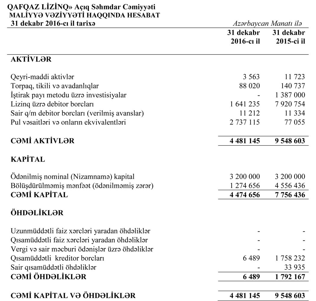 Şirkət 31 Dekabr 2016-cı il tarixində 4 milyon 475 min manat cəmi kapitala, 6 489 manat cəmi öhdəliklərə malik olub. 2015-ci ilin sonunda “QAFQAZ LİZİNQ”in cəmi kapitalı 7 milyon 756 min manat, cəmi öhdəlikləri isə 1 milyon 792 min manat idi. İki il ərzində yığılmış zərər şirkətin kapitalını azaldıb. Həmçinin ötən il şirkət qısamüddətli kreditor borclarından 1 milyon 758 min 232 manatını qaytarıb.