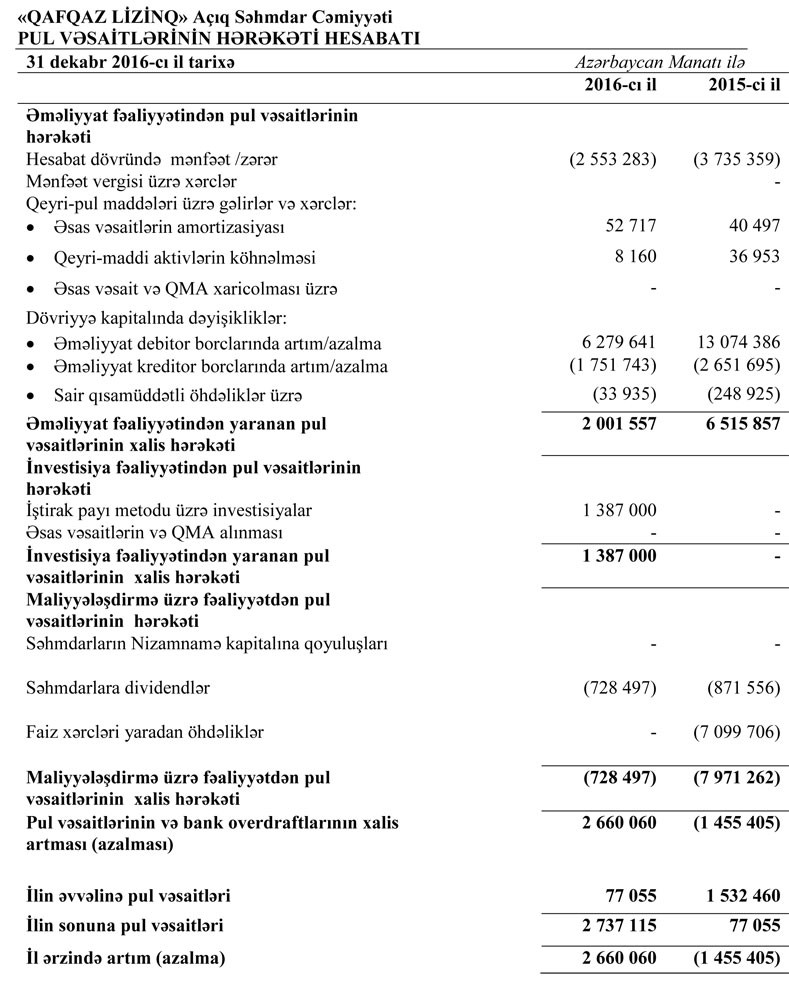 “QAFQAZ LİZİNQ” ASC 2016-cı ili 2 milyon 553 min manat xalis zərər ilə başa vurub.